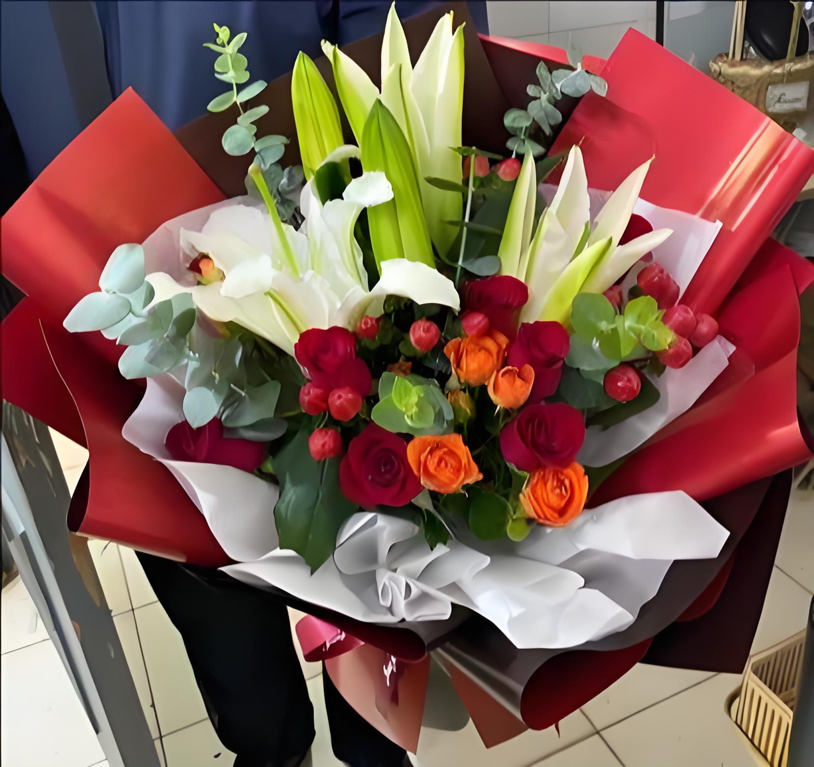 广州花都区花店包11枝红玫瑰、2枝多头白百合、6枝橙色多头玫瑰、红豆、尤加利叶